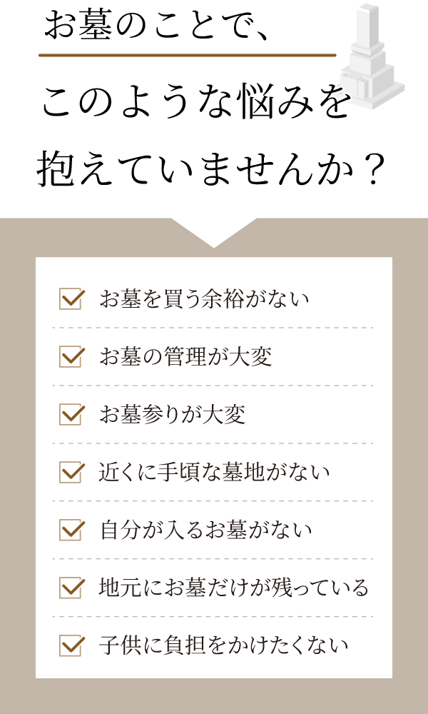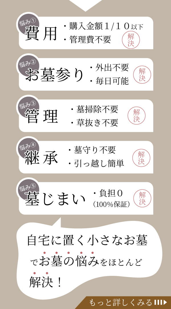 自宅に置いても邪魔にならないようコンパクトサイズで設計され、費用、継承、維持管理、お墓参りなどの負担がとても少なくなるお墓です。